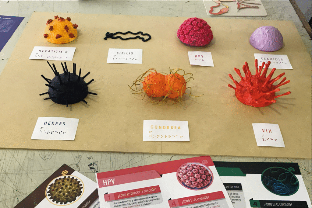 El proyecto cuenta con un desarrollo significativo, puesto que se parte de los resultados de las primeras propuestas que fueron realizadas dentro de la materia Diseño del hábitat accesible, en el segundo cuatrimestre de 2019 en FADU.[1] Surgió en el marco del proyecto UBATIC: ¨La tecnología digital empleada en la enseñanza del diseño de experiencias y el desarrollo de interfaces a partir de la Ergonomía aplicada para la producción de material didáctico accesible¨ (Director Walther Figueroa y codirectora responsable Andrea Wengrowicz). Se diseñaron materiales didácticos que permiten enseñar a través de diferentes estímulos sensoriales, siendo elementos corpóreos para ver y tocar, piezas gráficas y audiovisuales. Se emplearon diversas escalas, cortes de piezas o partes del cuerpo humano en i3D o hechos con corte laser.[2] Se diseñó material gráfico con esquemas y textos en lenguaje sencillo y en braille, con códigos QR que permiten acceder a videos o audios explicativos. Se abordaron en un inicio diferentes temas: sistemas reproductores; métodos anticonceptivos; infecciones de transmisión sexual; prevención en salud y cuidado del cuerpo, cáncer: autoexamen y detección temprana; ciclo menstrual y lo emocional; diversidad de género. Son propuestas que debían evolucionar como sistema de kit, testearse y validarse con los usuarios en los ámbitos educativos y de prevención en salud.
